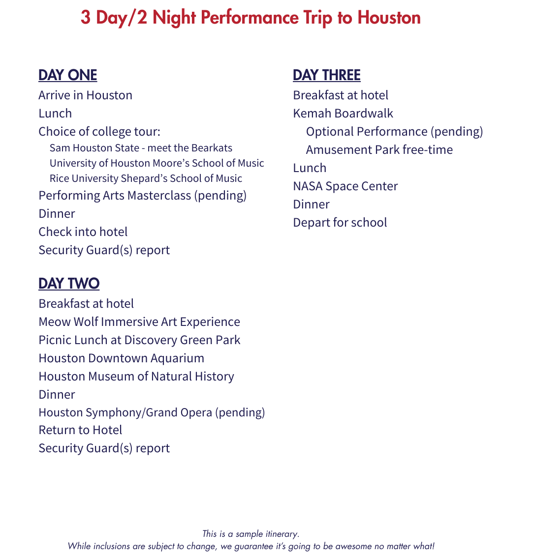 Partnering with School Tours of America means all the details are covered, from hotels and flights to meals and admissions.
