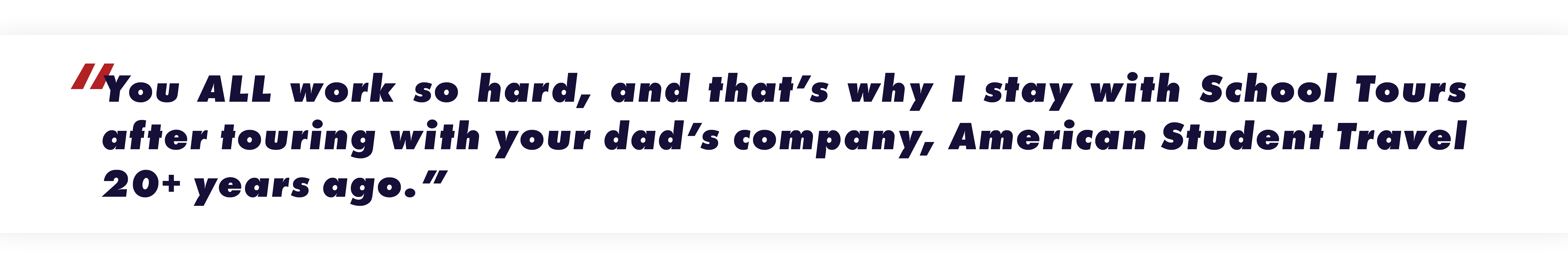 School Tours of America is so grateful for the opportunity to prove that we truly care about the needs of each individual traveler as if they were our own family. The positive comments we hear from YOU: our beloved educators and parents, have strengthened our mission and brought smiles to our faces when we needed it most.