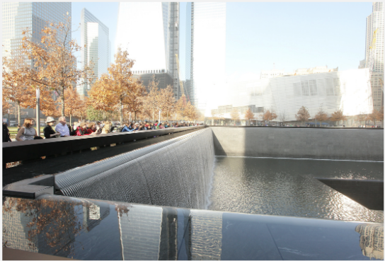 The 9/11 Memorial in New York City sits at the footprints of the North and South Towers; each memorial is nearly one acre in size. The memorial's reflecting ponds are the largest man-made waterfalls in North America; the water falls 30 feet into a square basin and then drops another 20 feet into a central void. This symbolism was described as "absence made visible" by the architect, Michael Arad, explaining how the water flows into voids that can never be filled. Around the edge of each memorial pool are the names that were lost from all three crash sites.