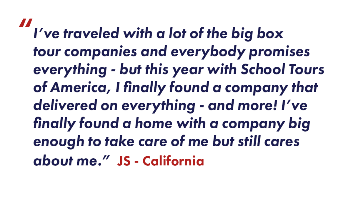 That’s why, even amid the depths of the pandemic, we made historic “people-first” decisions, like allowing participants a late enrollment period for our full refund program to give confidence to travel. STA supplied an extra complimentary “medical chaperone” during our return to travel last year, giving needed confidence to group leaders and parents. And we have helped large and small groups alike with our traveler centric approach. In every case, our desire was not to follow the mistakes of the other companies, but instead, to blaze the trail by providing the best travel programs possible with the highest level of support, while staying true to our core values of creating life changing travel experiences together.