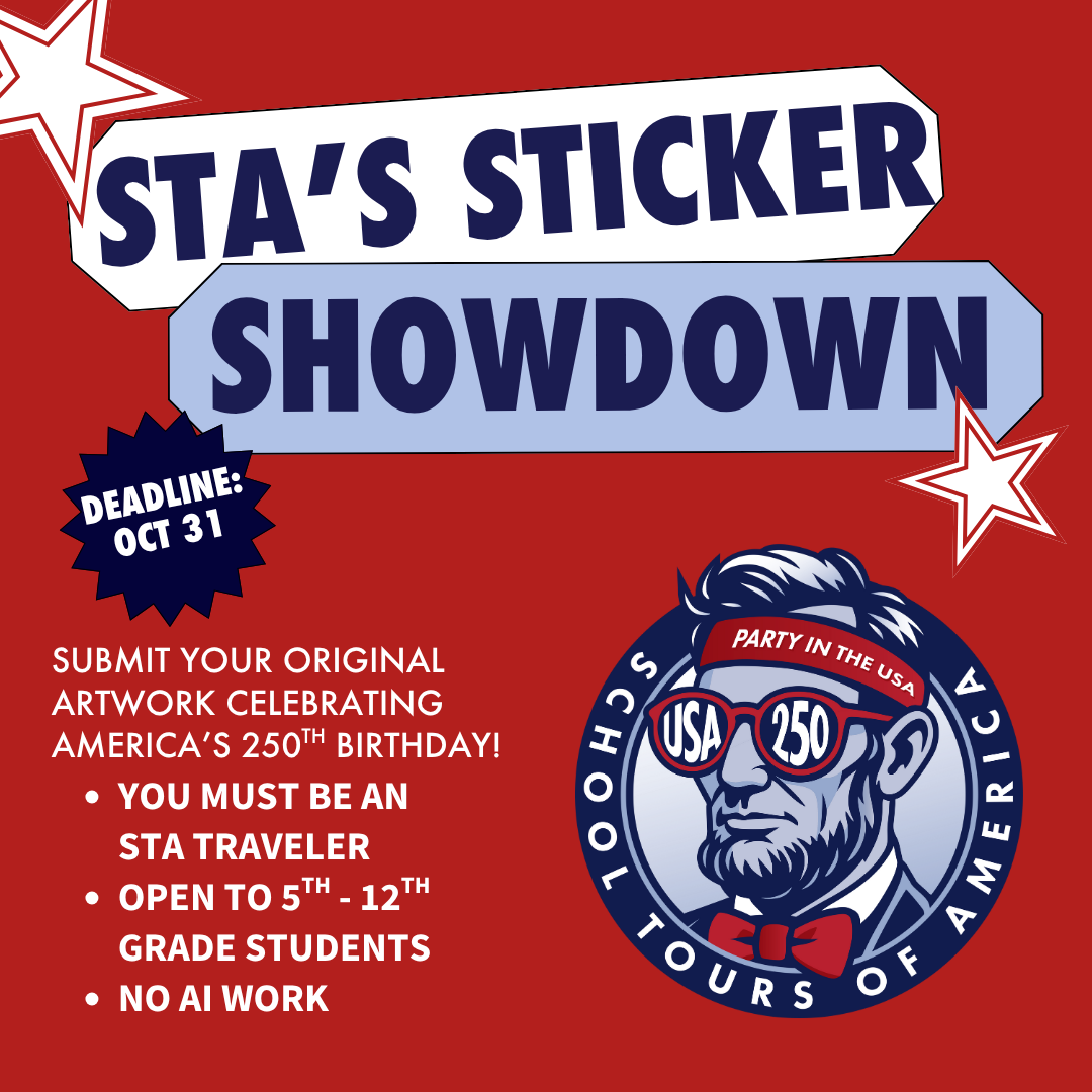 The 250th Sticker Showdown is a student contest sponsored by School Tours of America to celebrate the nation's semiquincentennial in 2026, marking the 250th anniversary of the signing of the Declaration of Independence. School Tours of America invites students in grades 5-12 to participate in this historic milestone by creating a design for a sticker that will be included in the travel packets distributed to all of STA's tour groups traveling during 2026!