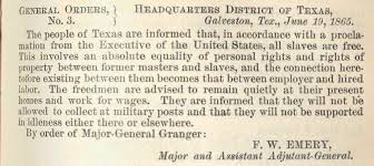 Juneteenth is short for June Nineteenth, specifically June 19, 1865. It was on this date that Union troops led by Major General Gordon Granger arrived in Galveston, Texas, with General Order No. 3, which informed all Texans that, in accordance with a Proclamation from the Executive of the United States, all slaves were free. Texas was the last state to officially hear and implement the terms of the Emancipation Proclamation, making this date significant to American history.