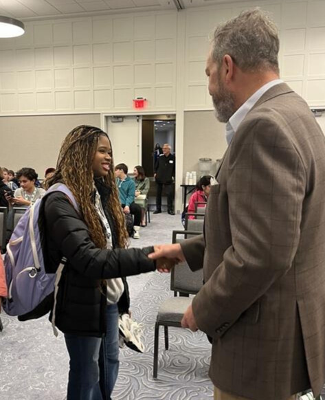 His message of resilience and purpose resonates deeply as students actively participate throughout the presentation and receive a custom challenge coin symbolizing the values he inspires. The impact continues beyond the stage, as he invites questions and personally greets each student, reinforcing confidence, respect, and the importance of strong eye contact.